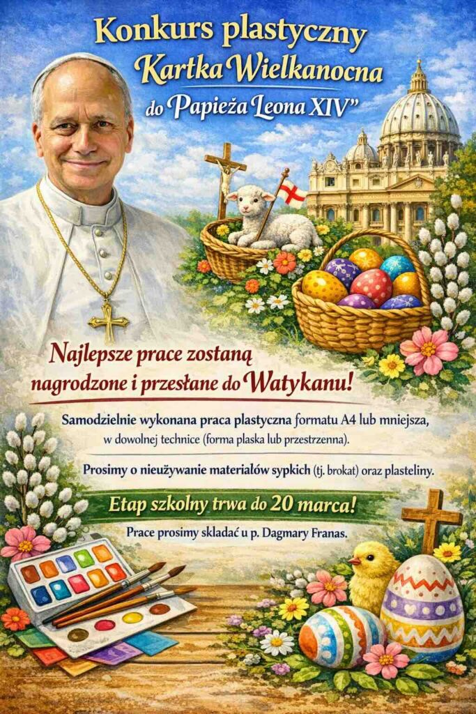 Kartka Wielkanocna dla Papieża Leona XIV Post published:1 marca 2026 regulamin_konkurs_kartka_wielkanocna_do_papieza_leona Może ci się spodobać również Bezpieczne ferie 2025 23 stycznia 2025 Wiara, nadzieja i miłość 4 kwietnia 2025 Lista kandydatów do klasy pierwszej 22 kwietnia 2024