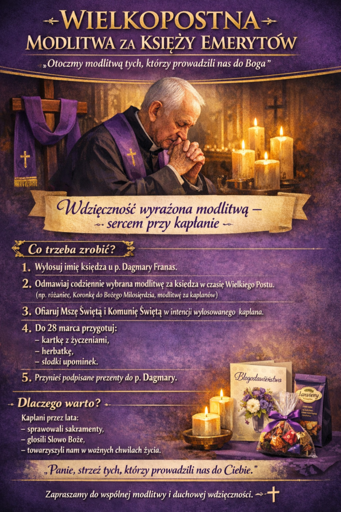 Modlitwa za Kapłanów 2026 Post published:26 lutego 2026 Może ci się spodobać również Pierwsza pomoc przedmedyczna 15 czerwca 2024 Wycieczka do Wrocławia 9 listopada 2024 Baśnie Dalekiego Wschodu 29 listopada 2024