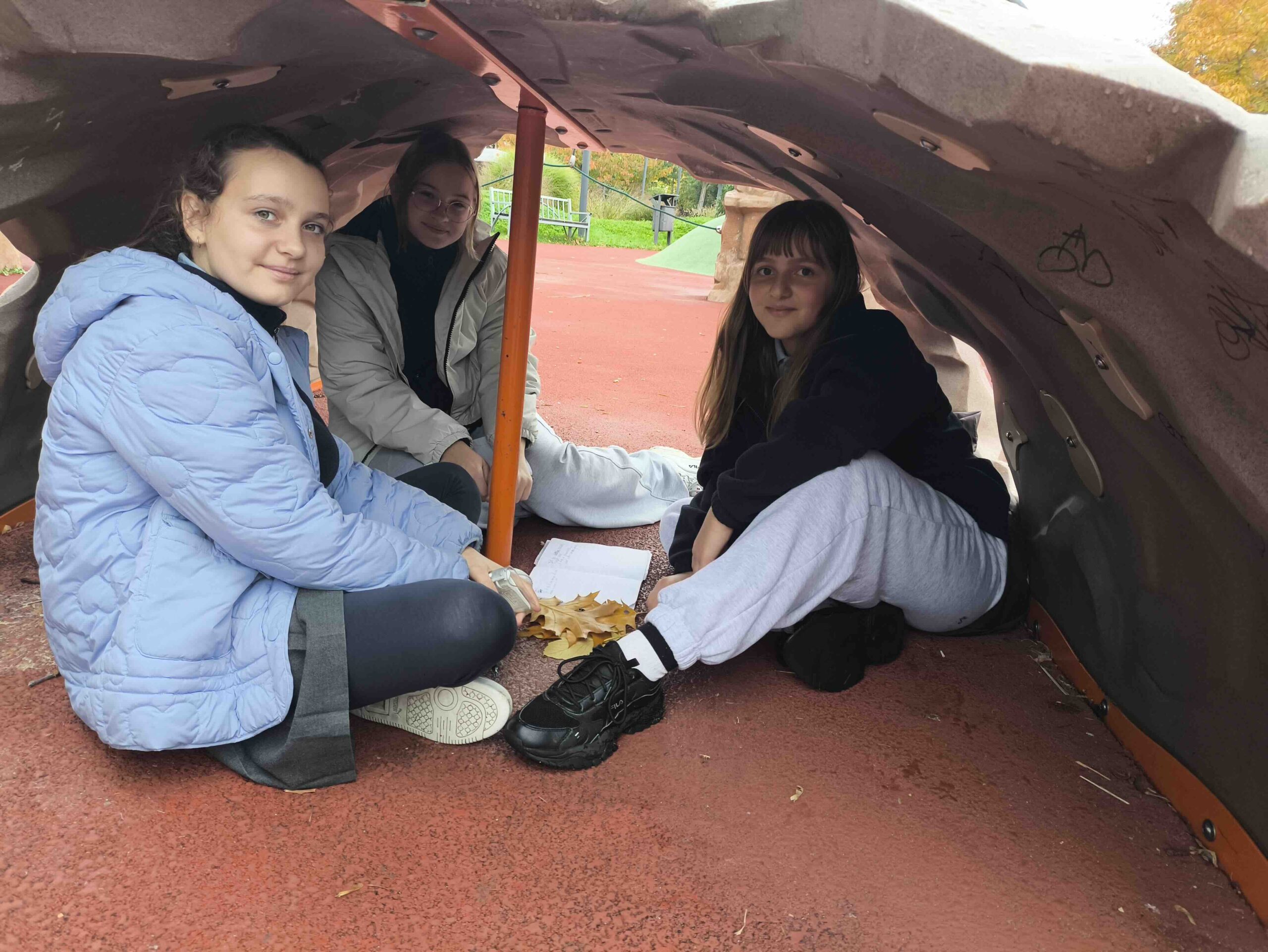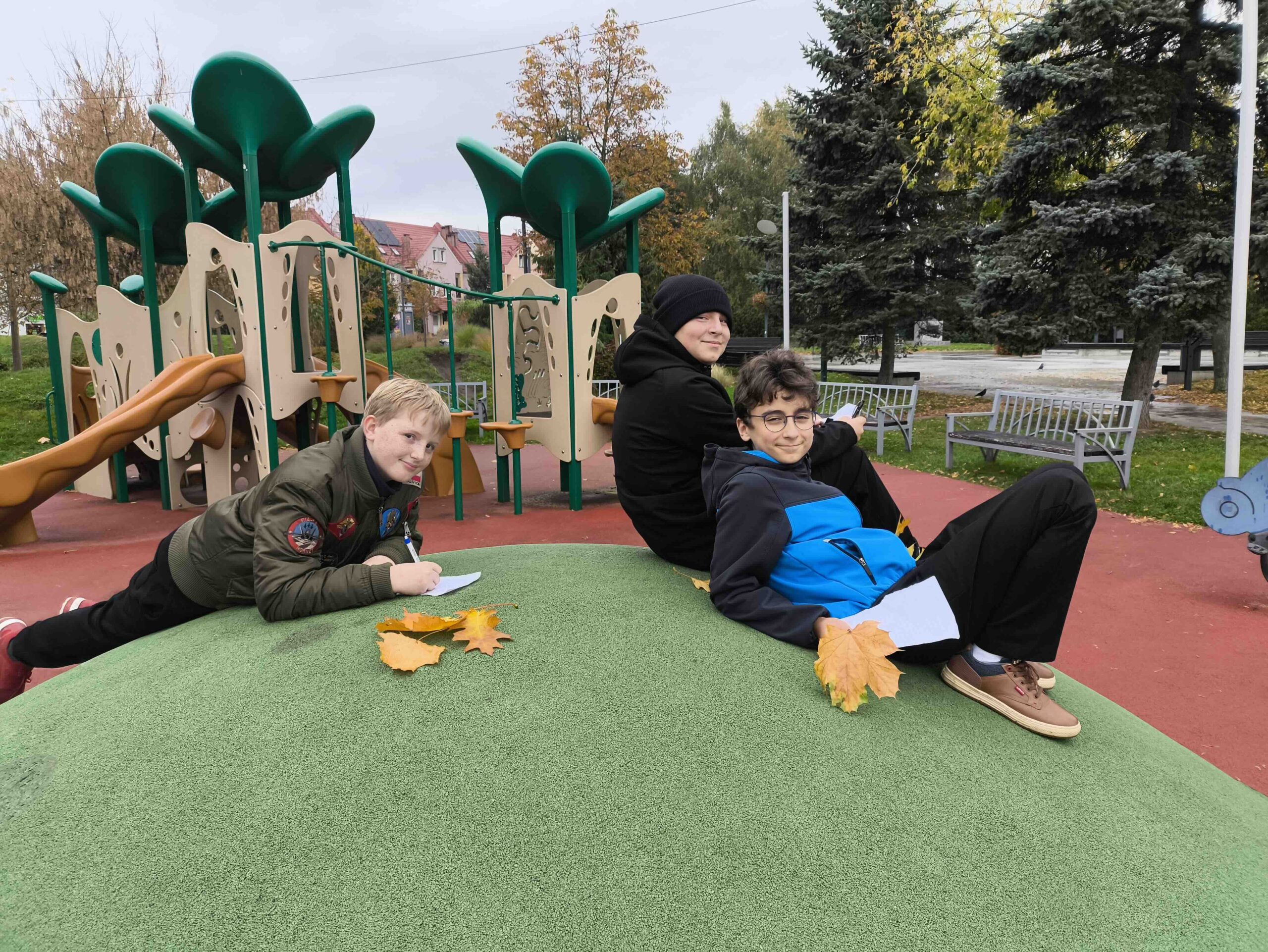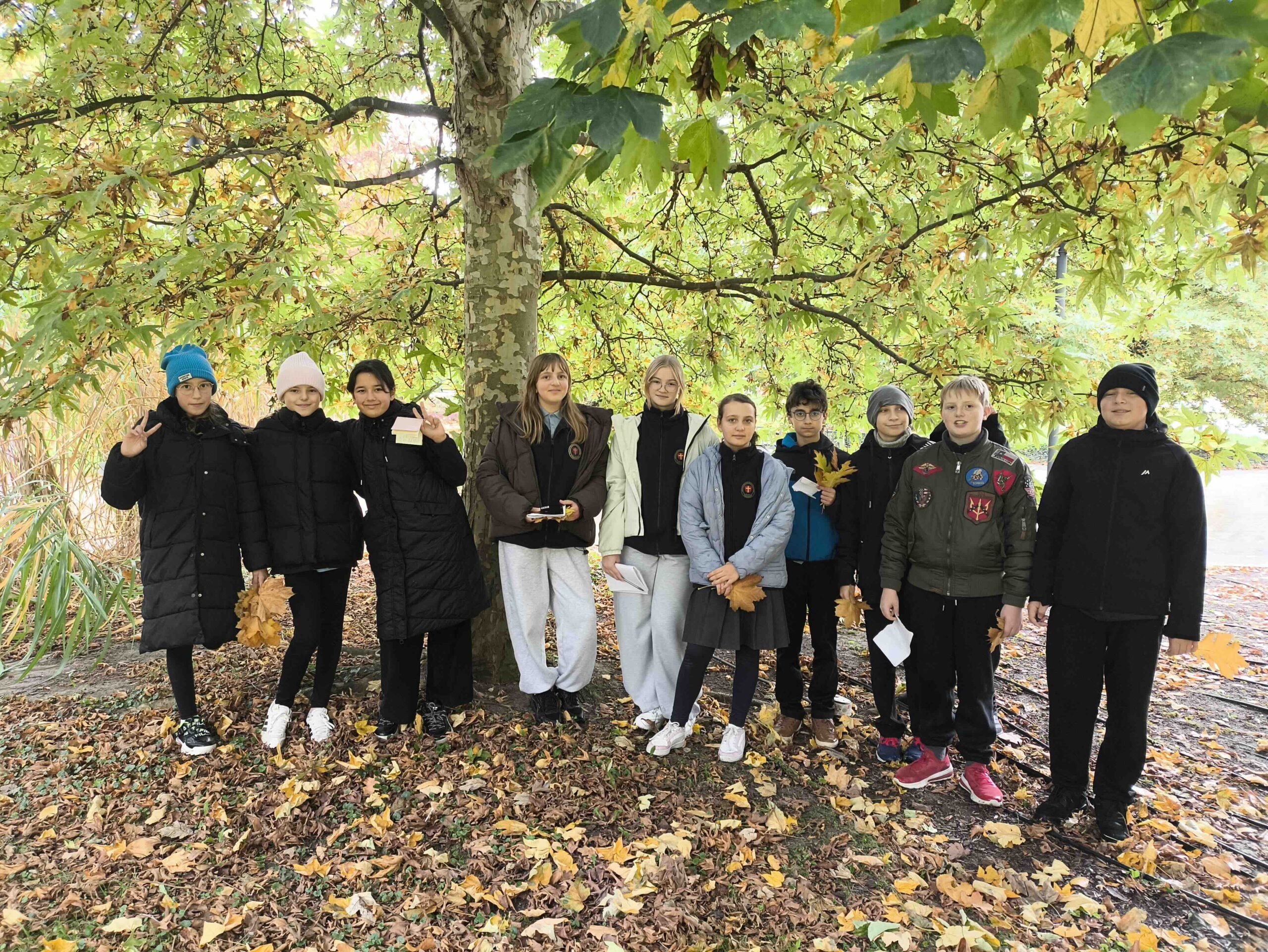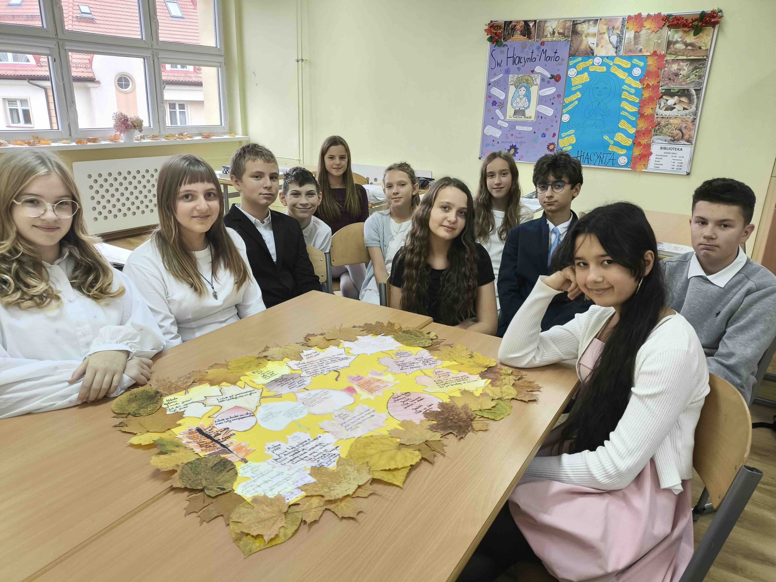 22 października 2025r. uczniowie klasy VI św. Hiacynty Marto uczestniczyli w nietypowej lekcji języka polskiego. Zajęcia odbyły się w ramach realizowanej w szkole innowacji pedagogicznej „Polonistyczne przygody”. Dzieci wyszły na spacer do polkowickiego parku. W czasie przechadzki uczniowie pisali wiersze, czerpiąc inspirację z bezpośredniego kontaktu z naturą. Po powrocie do szkoły dzieci odrysowywały na kartkach jesienne liście zebrane w czasie spaceru. Na pokolorowanych liściach zapisały stworzone wcześniej przez siebie wiersze. W czasie warsztatów literackich ujawniły się skrywane dotąd talenty poetyckie. Zajęcia na świeżym powietrzu, w otoczeniu pięknej, jesiennej przyrody przyniosły wiele radości, dostarczyły ciekawych wrażeń, wpłynęły na poprawę kondycji fizycznej i wzmocniły wzajemne relacje. 😊