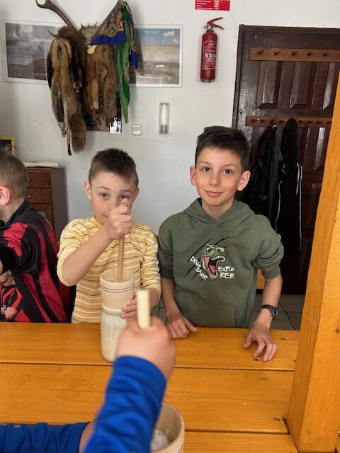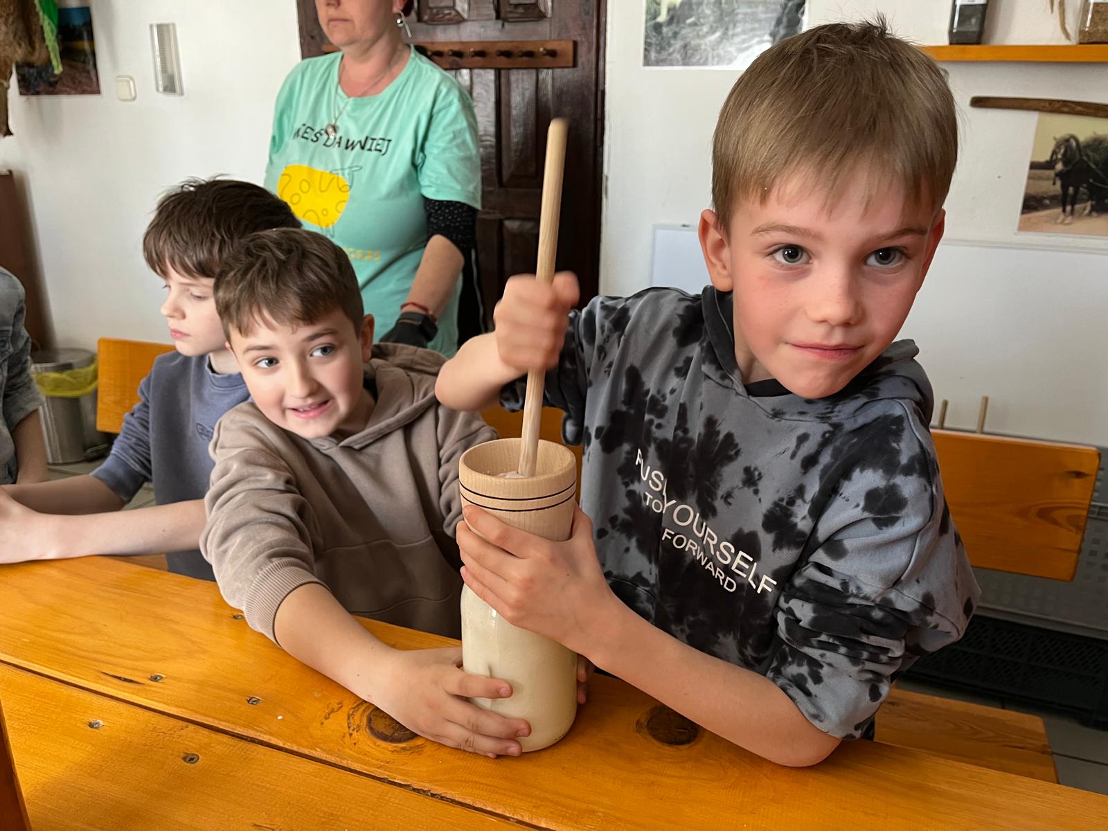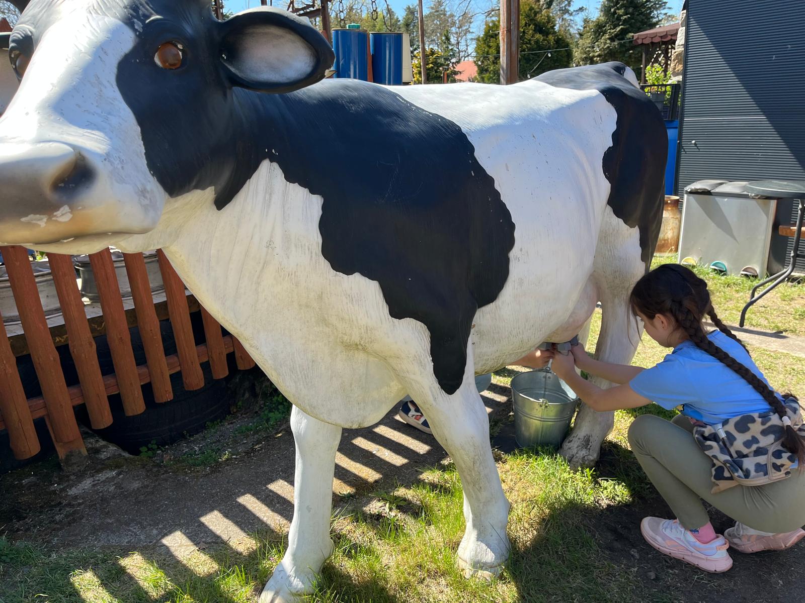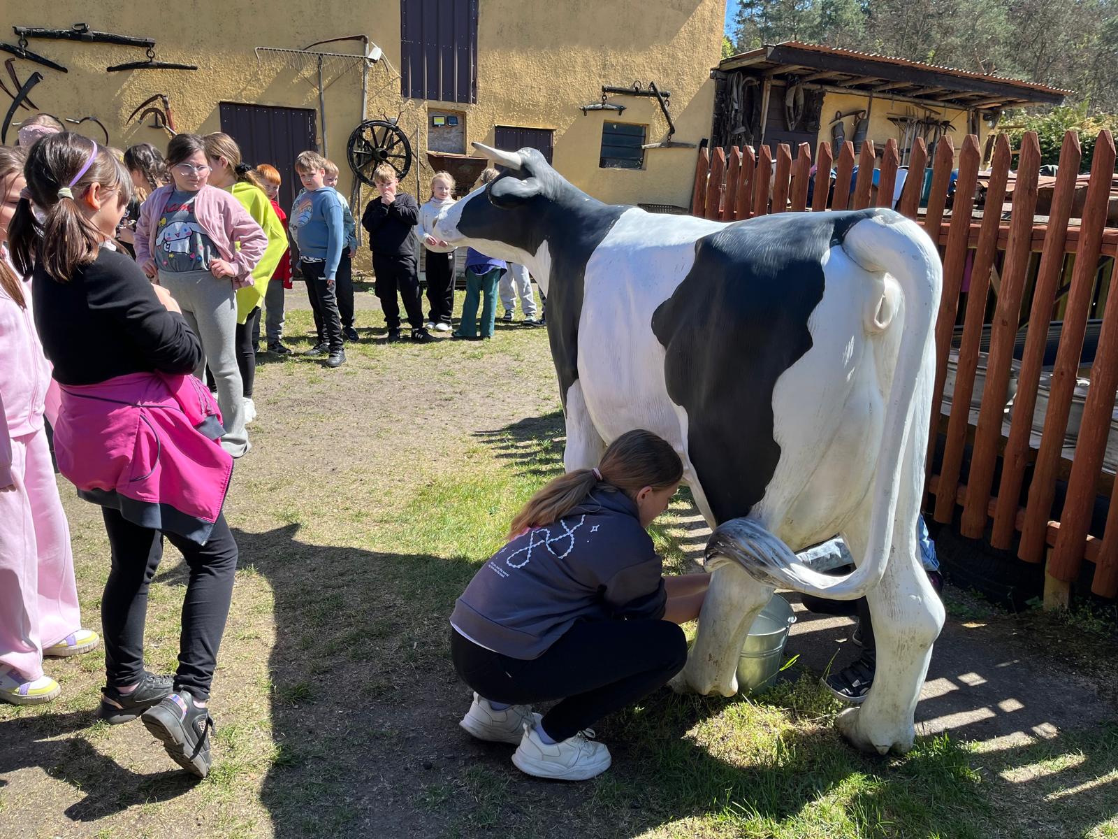 Dnia 28 kwietnia 2026 r. uczniowie klas 1–3 uczestniczyli w wycieczce do gospodarstwa agroturystycznego „Świerkowe Zacisze” w Jakubowie Lubińskim. W trakcie zajęć uczyli się doić krowę, poznawali dawny sprzęt gospodarstwa domowego, samodzielnie wyrabiali w masielniczkach masło widząc na bieżąco stopień jego wyrobienia, przygotowywali lemoniadę, by później móc z apetytem skosztować swoje wyroby. Po zajęciach warsztatowych wzięli udział w zajęciach rekreacyjnych na świeżym powietrzu. Wycieczka zakończyła się wspólnym grillem. Czas spędzony w miłej atmosferze pozwolił wszystkim w pełni się zrelaksować.