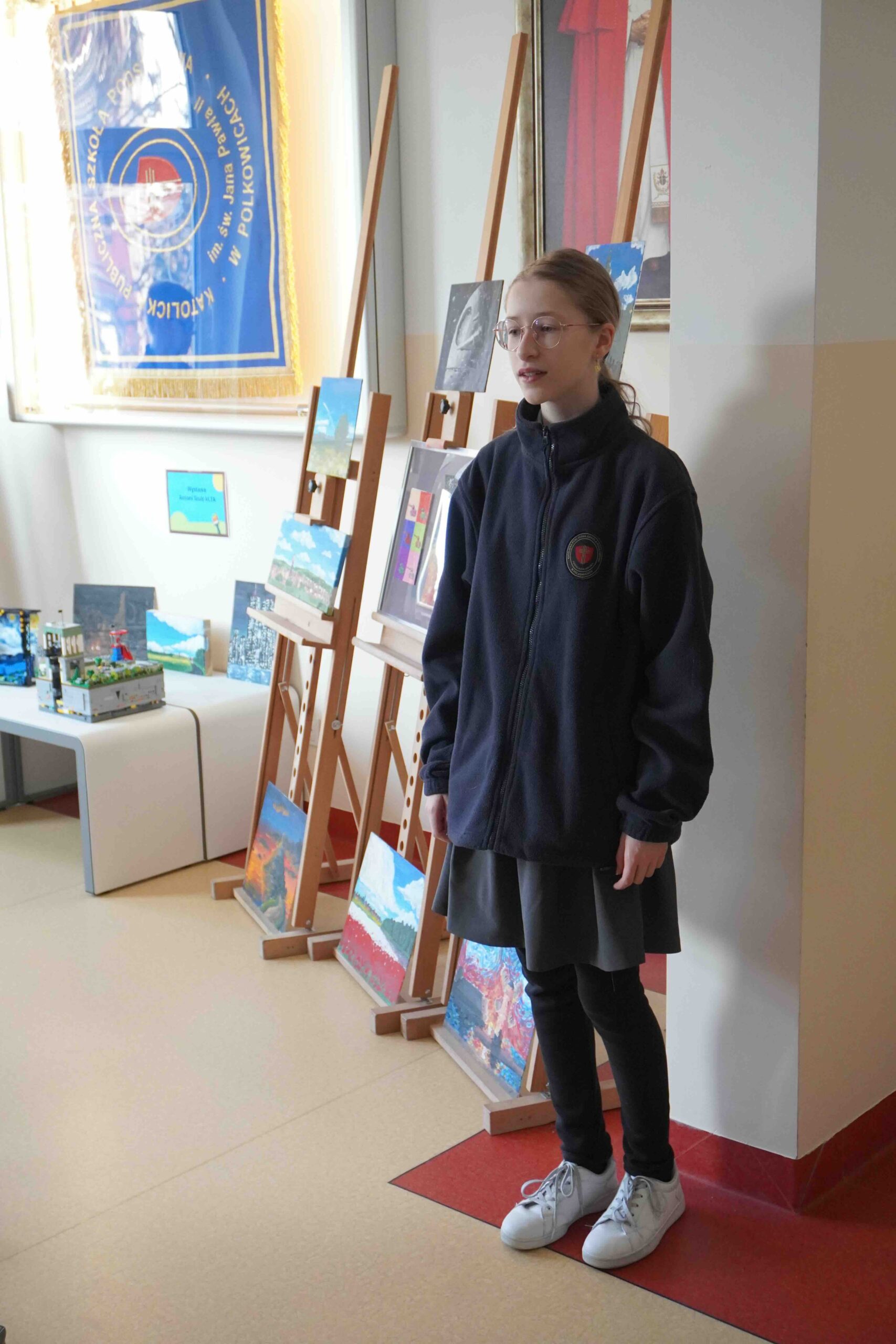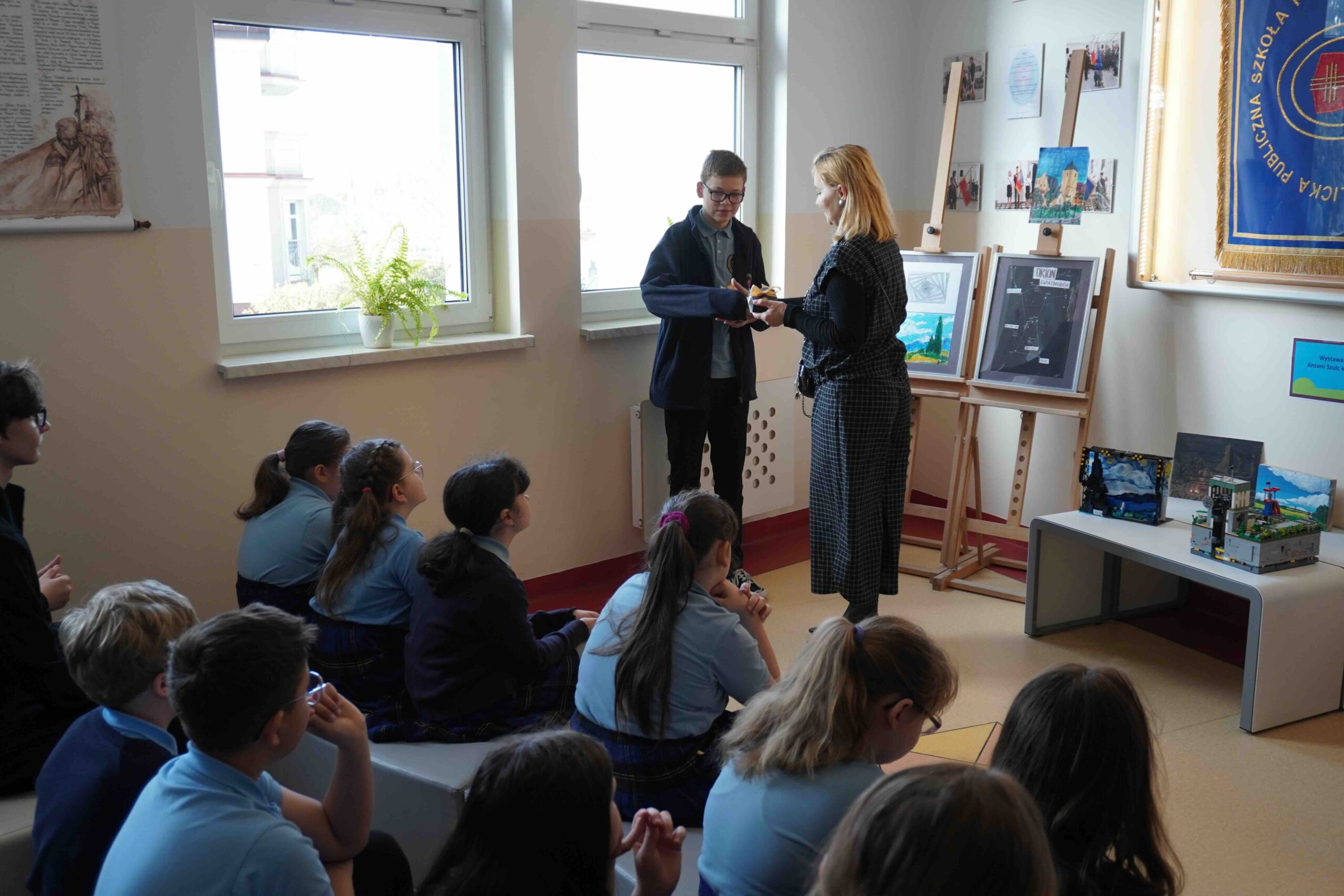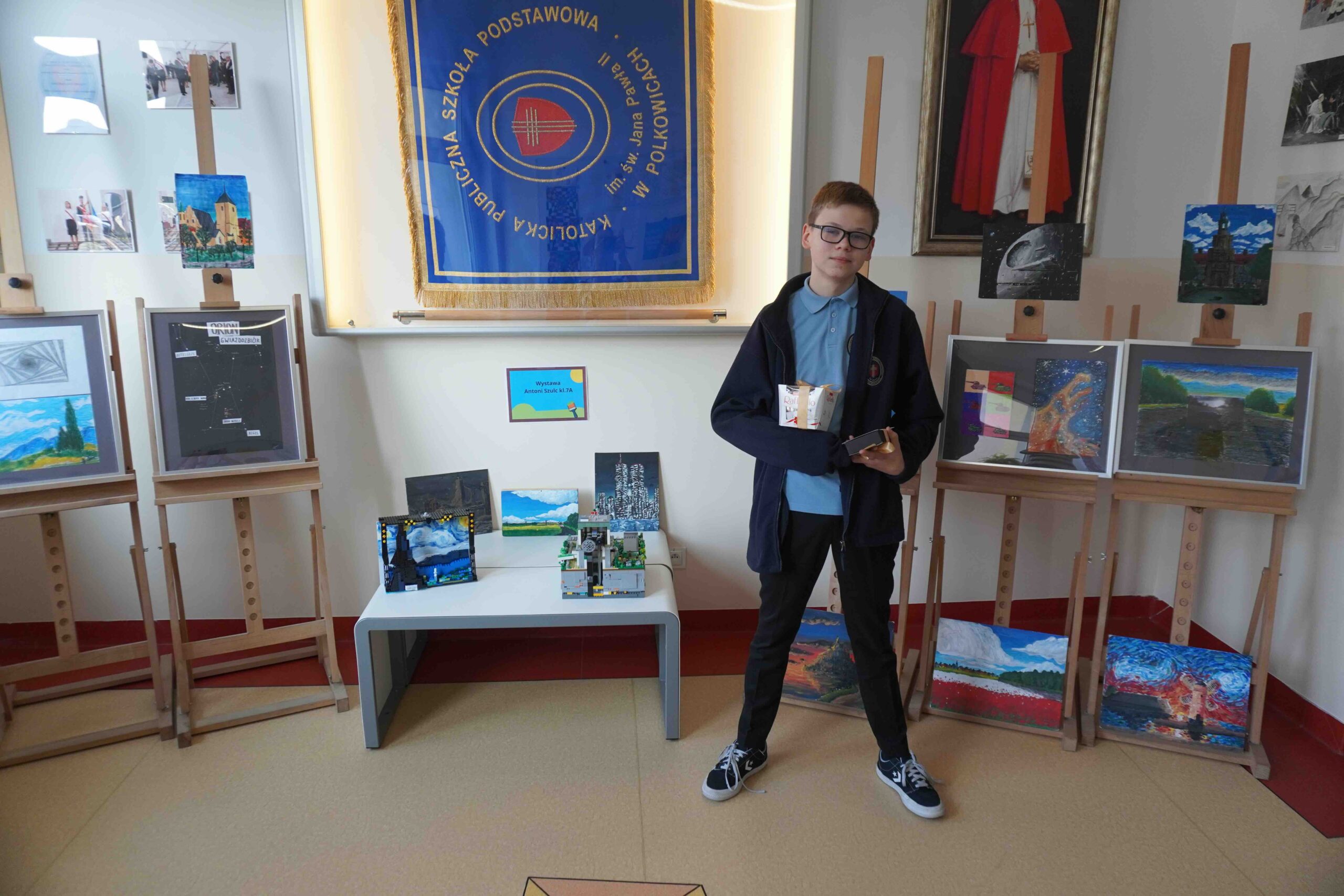Dnia 15 kwietnia przypada Międzynarodowy Dzień Sztuki. Data ta została ustalona w 2012 roku na cześć urodzin Leonarda da Vinci jako symbol pokoju na świecie, braterstwa i wielokulturowości a także znaczenia sztuki dla innych dziedzin. Nasza szkoła włączyła się w to wydarzenie organizując wernisaż wystawy dzieł naszego uzdolnionego plastycznie ucznia klasy 7 P. Antoniego Szulca. Prezentowanie były obrazy malowane na płótnie, desce oraz formy przestrzenne z klocków. Na zakończenie uczennica Paulina Dąbrowska wyrecytowała wiersz. Dziękuję samorządowi uczniowskiemu za przygotowanie plakatu oraz pytań podczas wernisażu.