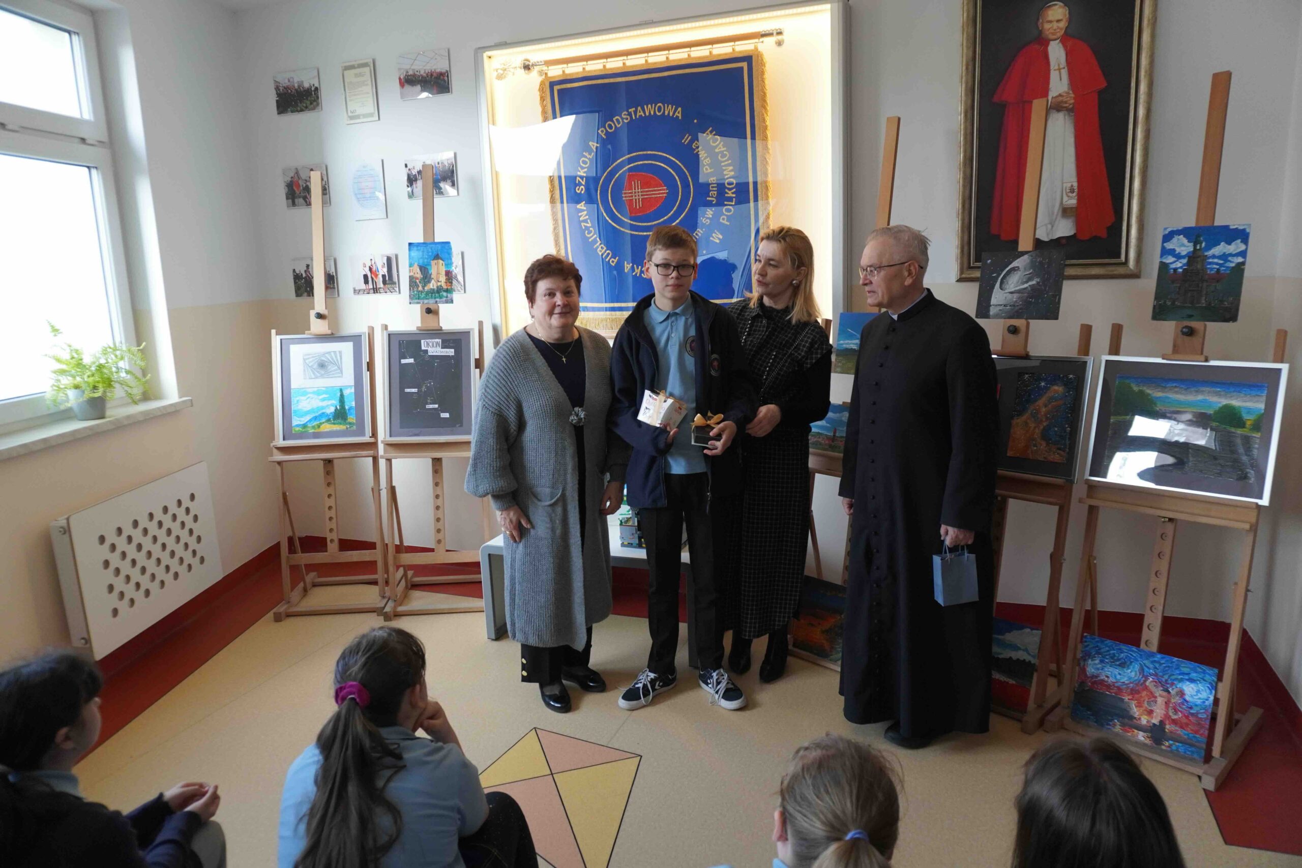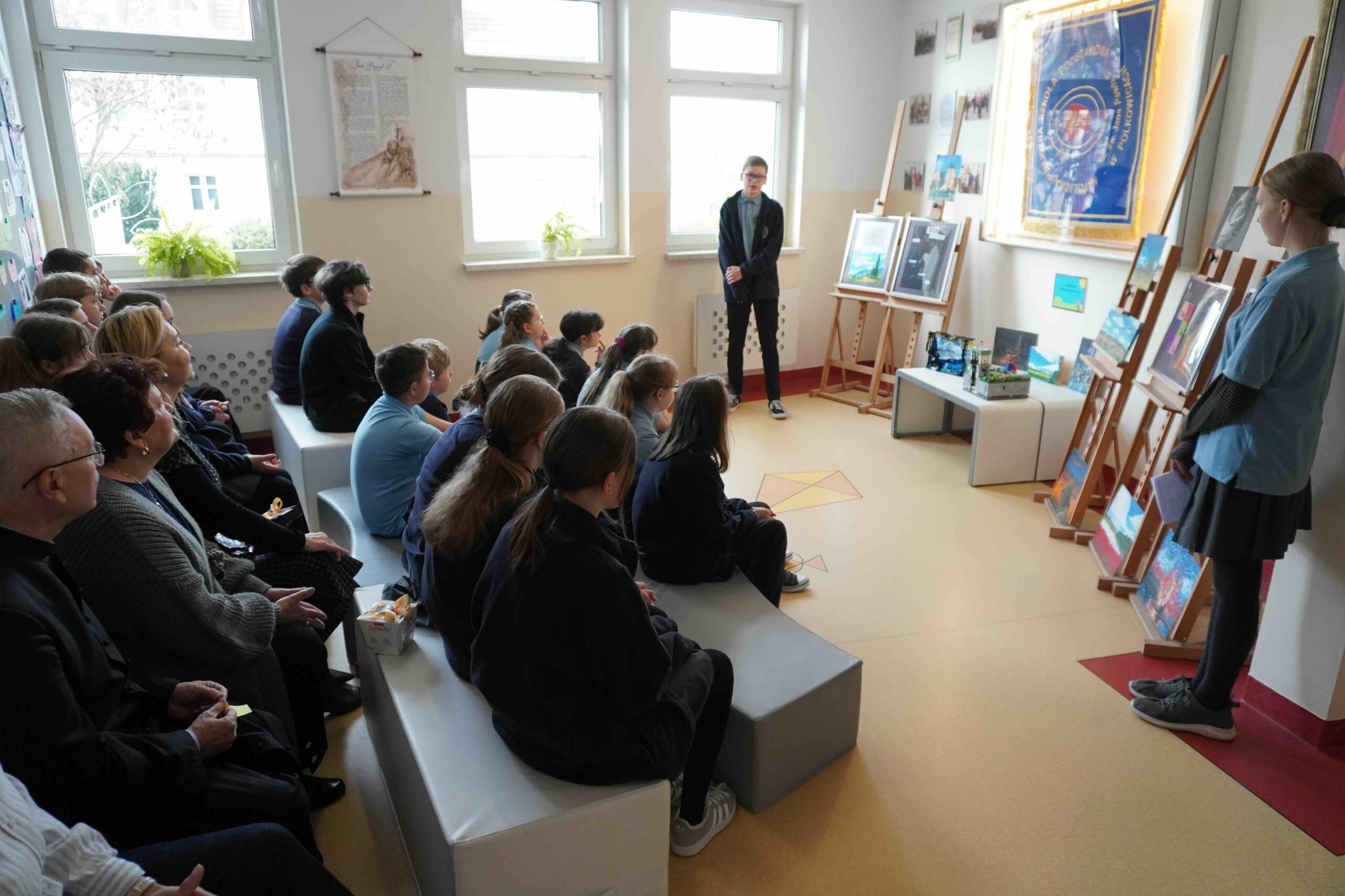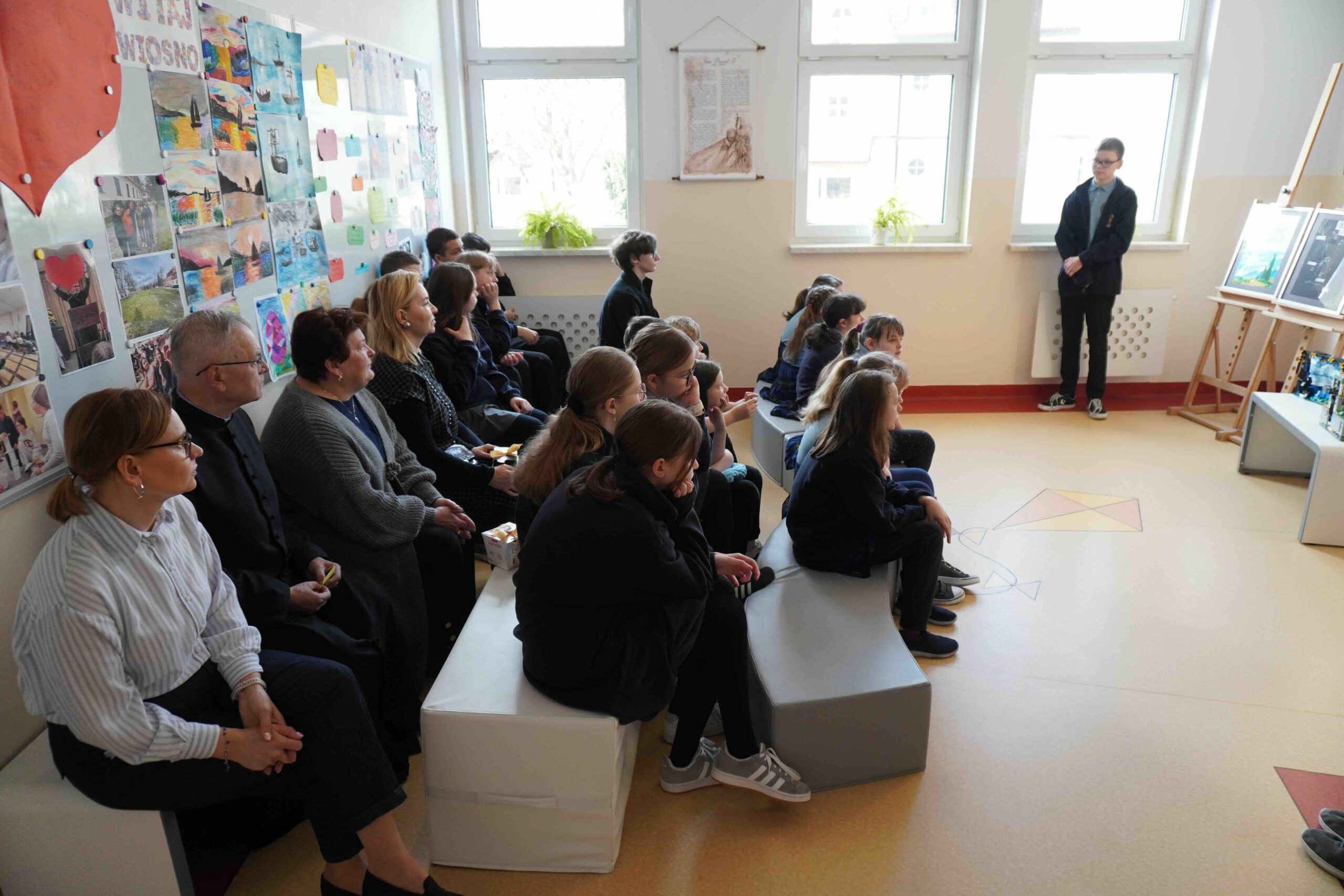 Dnia 15 kwietnia przypada Międzynarodowy Dzień Sztuki. Data ta została ustalona w 2012 roku na cześć urodzin Leonarda da Vinci jako symbol pokoju na świecie, braterstwa i wielokulturowości a także znaczenia sztuki dla innych dziedzin. Nasza szkoła włączyła się w to wydarzenie organizując wernisaż wystawy dzieł naszego uzdolnionego plastycznie ucznia klasy 7 P. Antoniego Szulca. Prezentowanie były obrazy malowane na płótnie, desce oraz formy przestrzenne z klocków. Na zakończenie uczennica Paulina Dąbrowska wyrecytowała wiersz. Dziękuję samorządowi uczniowskiemu za przygotowanie plakatu oraz pytań podczas wernisażu.